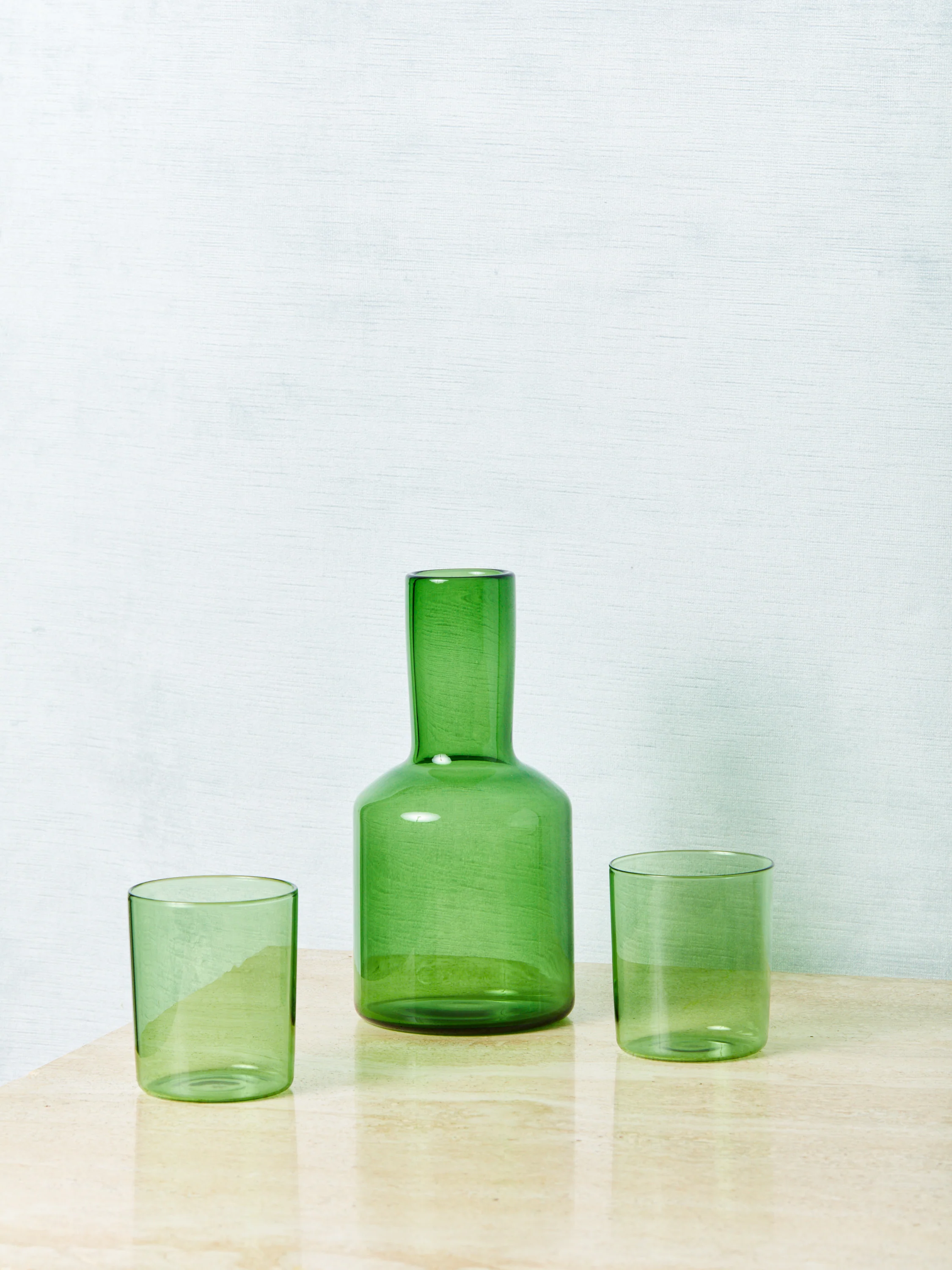 Glass carafe and cup set inspired by traditional French bedside drinkware. An elegant tabletop essential that can be used anywhere as well as sweet flower vase.