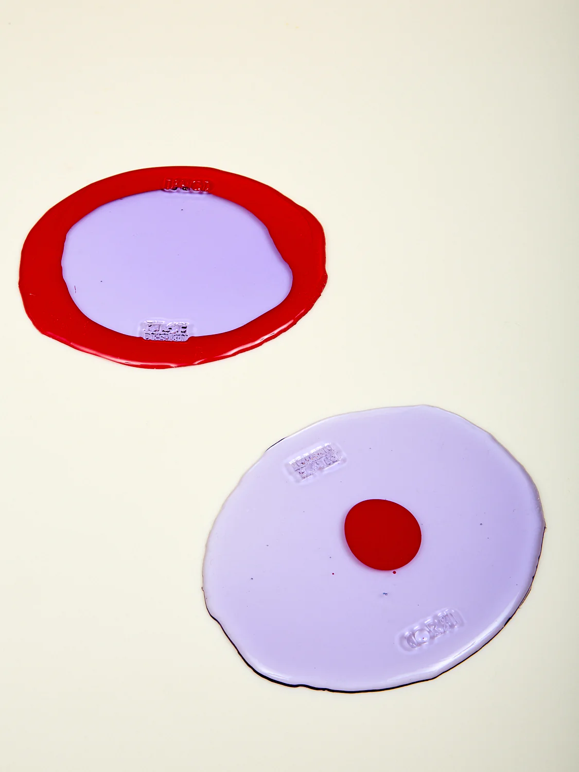 A pair of handmade resin table-mates in small, perfect for use as coasters. Each pair features 2 unique coasters, one with a dot, one with a border.