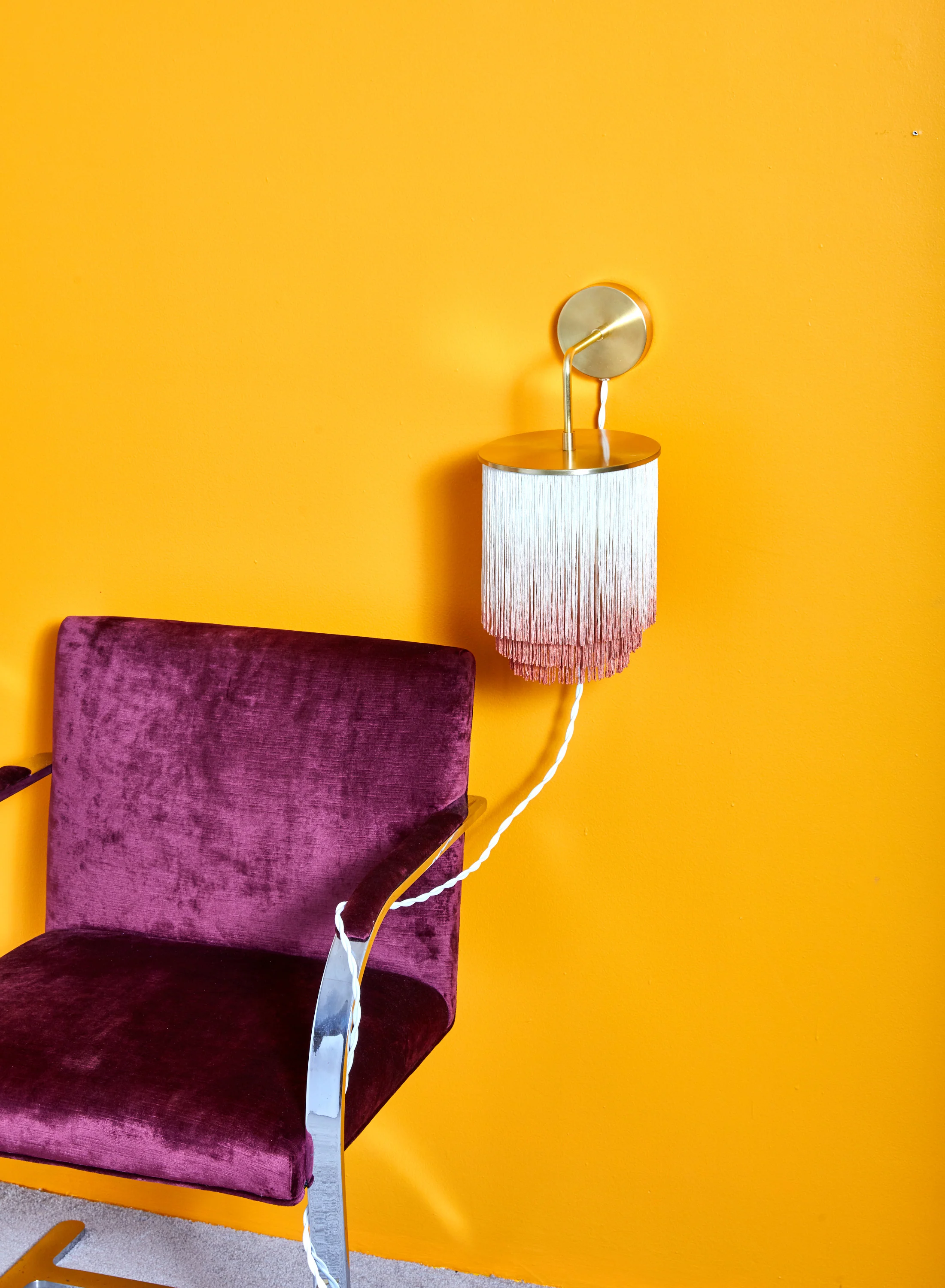 Plug in wall sconce made of brass and hand dyed silk fringe. Renter friendly, easy to install, and it gives off a lovely warm glow! Beautiful beside your bed, your couch, or your favorite reading chair. Available in other fringe colors by request.