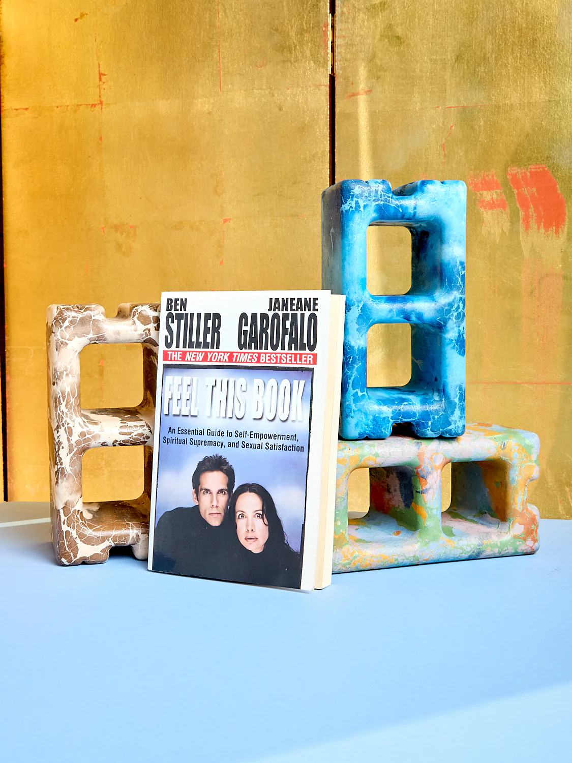 Mini handmade cast-concrete cinder blocks perfect for use as book ends, utensil holders, pen cups, and more. Sold individually, available in various colors.
